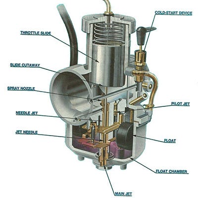 The rider controls the air and fuel flow by twisting the throttle, which opens a valve (either a flapper or a slide) allowing more air and fuel to enter the engine.